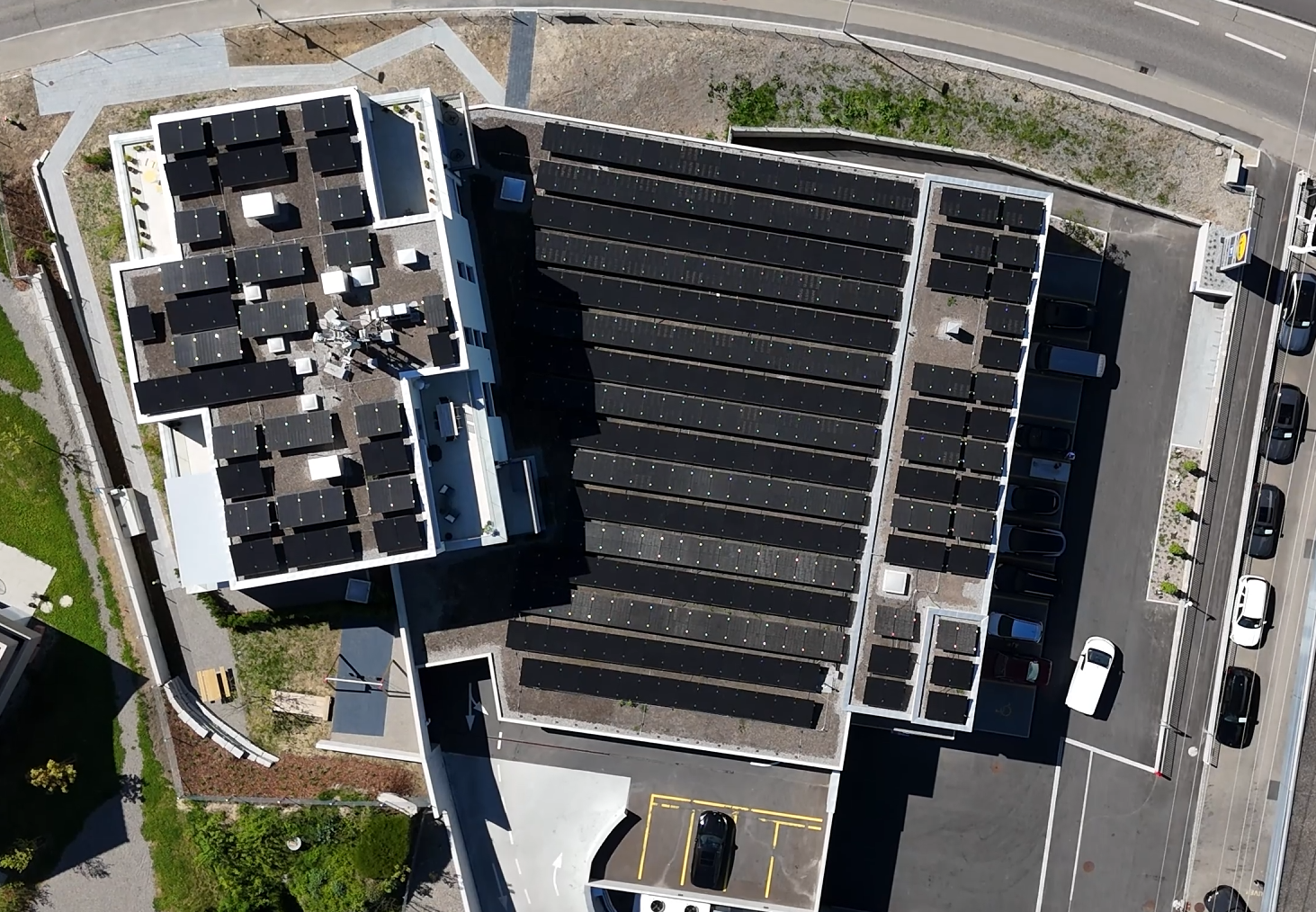 Le système installé sur le toit vert, d’une puissance de 175,36 kWc, constitue l’épine dorsale énergétique du projet. Grâce à l’autoconsommation physique groupée (ZEV), l’électricité produite localement est distribuée directement aux locataires, de manière efficace, rentable et indépendante du réseau public.